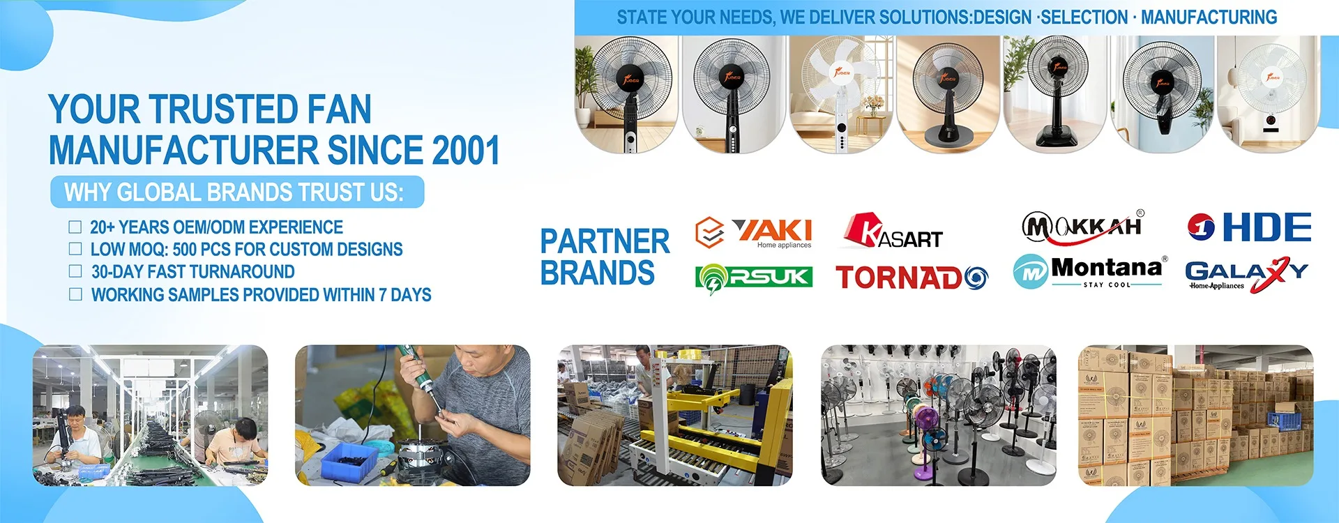 Our factory was established in 1998 and has more than ten years of experience in fan manufacturing and sales at home and abroad. Our factory covers an area of more than 20000 square meters and has a capacity of more than 2000 employees at most. We have an experienced production team and can handle various unexpected problems in the production process in a timely manner. Our products are sold all over the world with the advantages of good quality and fast delivery. If you want to cooperate easily and happily, then choose us